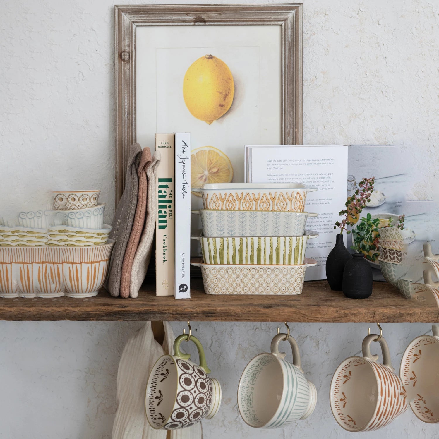 Steam, simmer, and sizzle in style with our thoughtfully crafted collection of cookware and bakeware. Explore a wide array of pieces that are both fashionable and functional including measuring cups, measuring spoons, bake pans, crocks, mixing bowls, batter bowls, berry baskets, scoops, strainers, spreaders, and so much more. Choose from a vast selection of materials from wood and steel to stoneware and glass, and styles from classic farmhouse and mid-century modern to vintage glam and southwestern. Add a touch of beauty to meal prep or holiday baking with this carefully curated collection of kitchen wares that are sure to impress. This eclectic set of bake pans showcases durable stoneware construction with 4 unique, hand-stamped designs. This piece is food safe. Dishwasher safe. Made from stoneware.