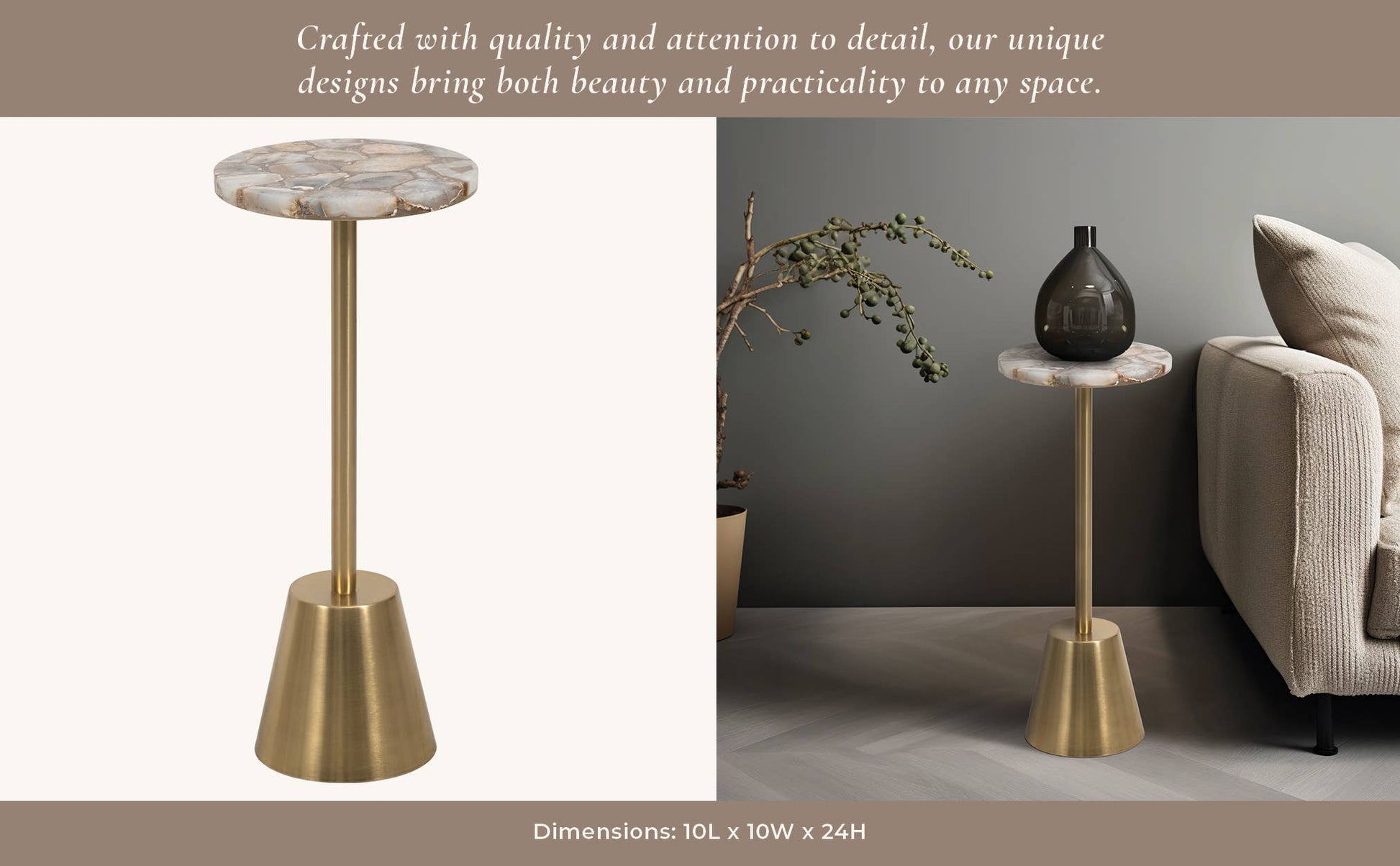 Enhance your home decor with this elegant accent table, designed to bring a touch of luxury and sophistication to any space. Featuring a stunning polished agate top, each table boasts a unique natural pattern, ensuring no two pieces are alike. The rich, organic texture of the stone pairs beautifully with the sleek gold metallic iron base, creating a perfect blend of modern elegance and timeless style. Crafted with high-quality materials, including metal, stone, and iron, this accent table is both stylish and durable. Measuring 10X10X24 inches, its compact design makes it an ideal addition to any room. Whether placed in the living room beside a sofa, in the bedroom as a chic nightstand, or in an office to elevate your workspace, this table offers both functionality and aesthetic appeal.