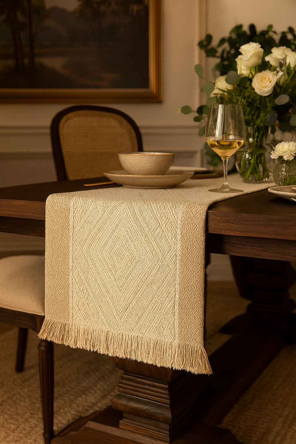 Beige Diamond Weave Fringed Cotton Blend Table Runner