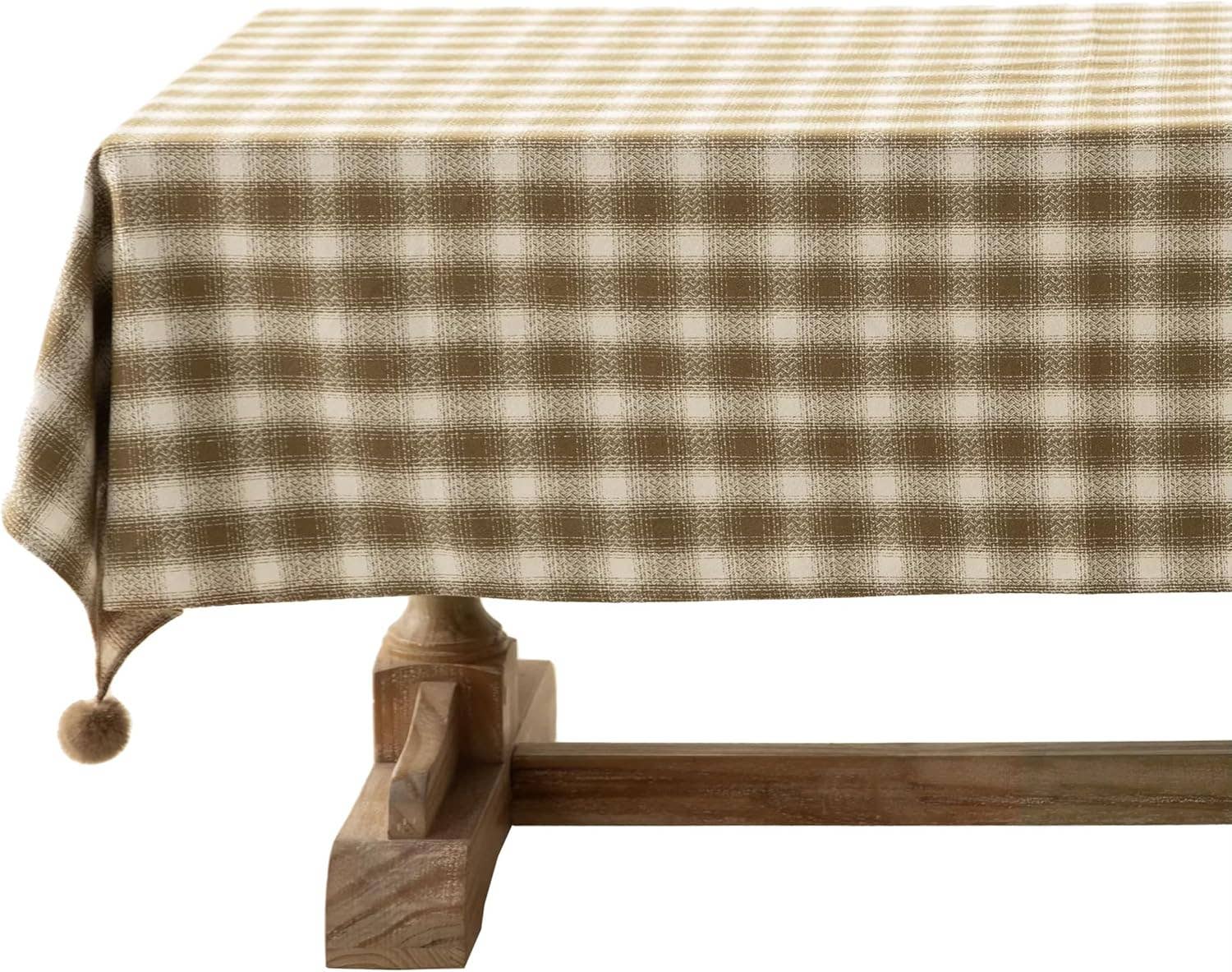 The timeless brown and cream plaid pattern adds a cozy, farmhouse appeal to your table setting, making it a versatile choice for everyday and special occasions. Adding a whimsical touch, the playful pom accents at the corners provide a unique flair, making this tablecloth a standout piece. Its plaid design and quality construction make it a cherished part of your holiday traditions, adding style and festive spirit to your celebrations. Size: 56"x 96” Material: Cotton Color: Brown, Cream Care: Machine wash