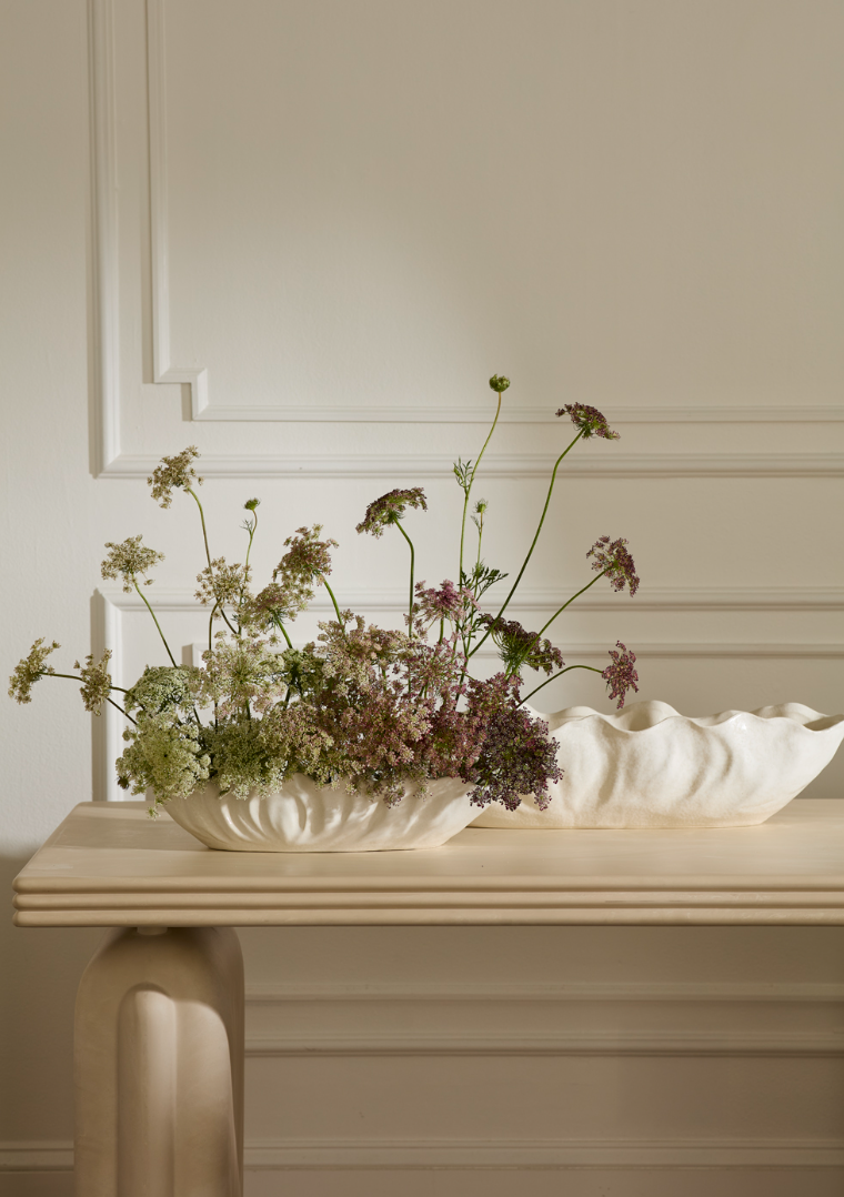 Celebrate artisanal style with the elongated wide ceramic Coastline Trough. Featuring an organic ruffled rim & a warm white reactive glaze that provides variation in the finish, this piece makes a lovely long centerpiece for floral arrangments, orchids, other blooming plants. The dimensions allow for any type of floral mechanics. This home decorative accent piece is a lovely display for a console, coffee table, or dining table.