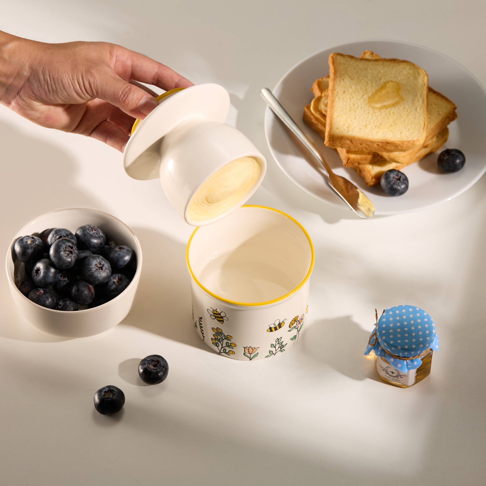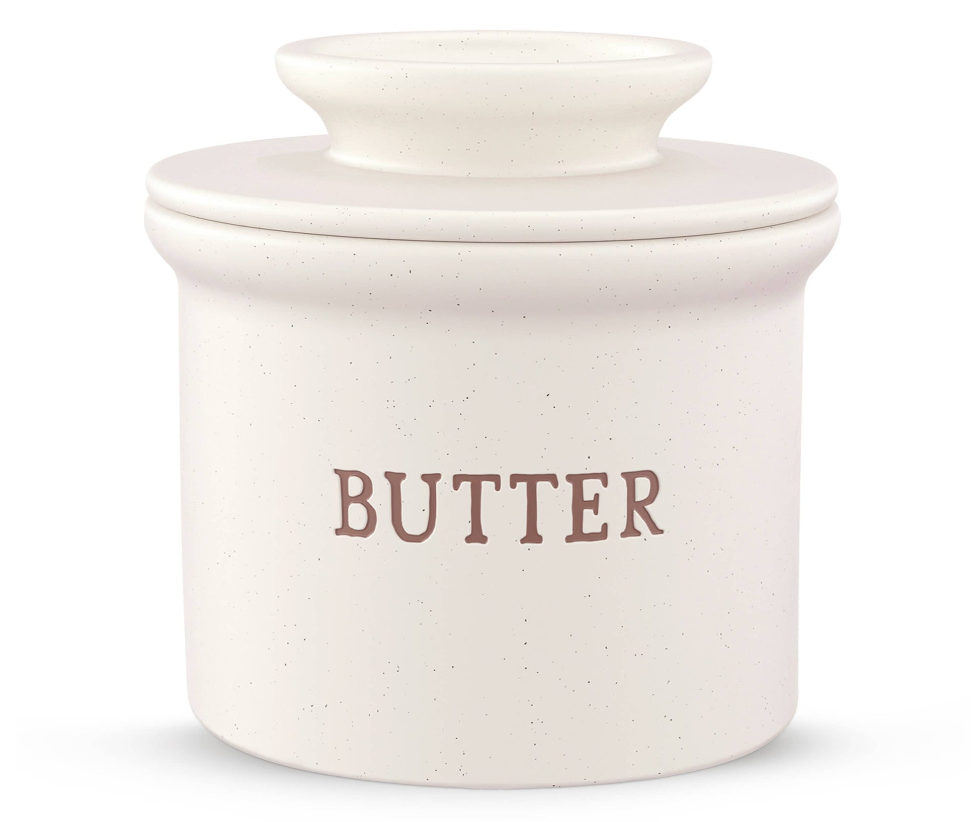 Say goodbye to cold, hard butter. This Butter Keeper keeps butter ready to spread on toast, biscuits, waffles, pancakes and more! Simply pour water into the crock, pack the Bell with softened butter, place the Bell into the crock, and voila! The water creates an airtight seal so butter stays fresh without refrigeration. Designed with high-quality speckled stoneware that’s dishwasher safe and fits about 1 ½ sticks of butter.