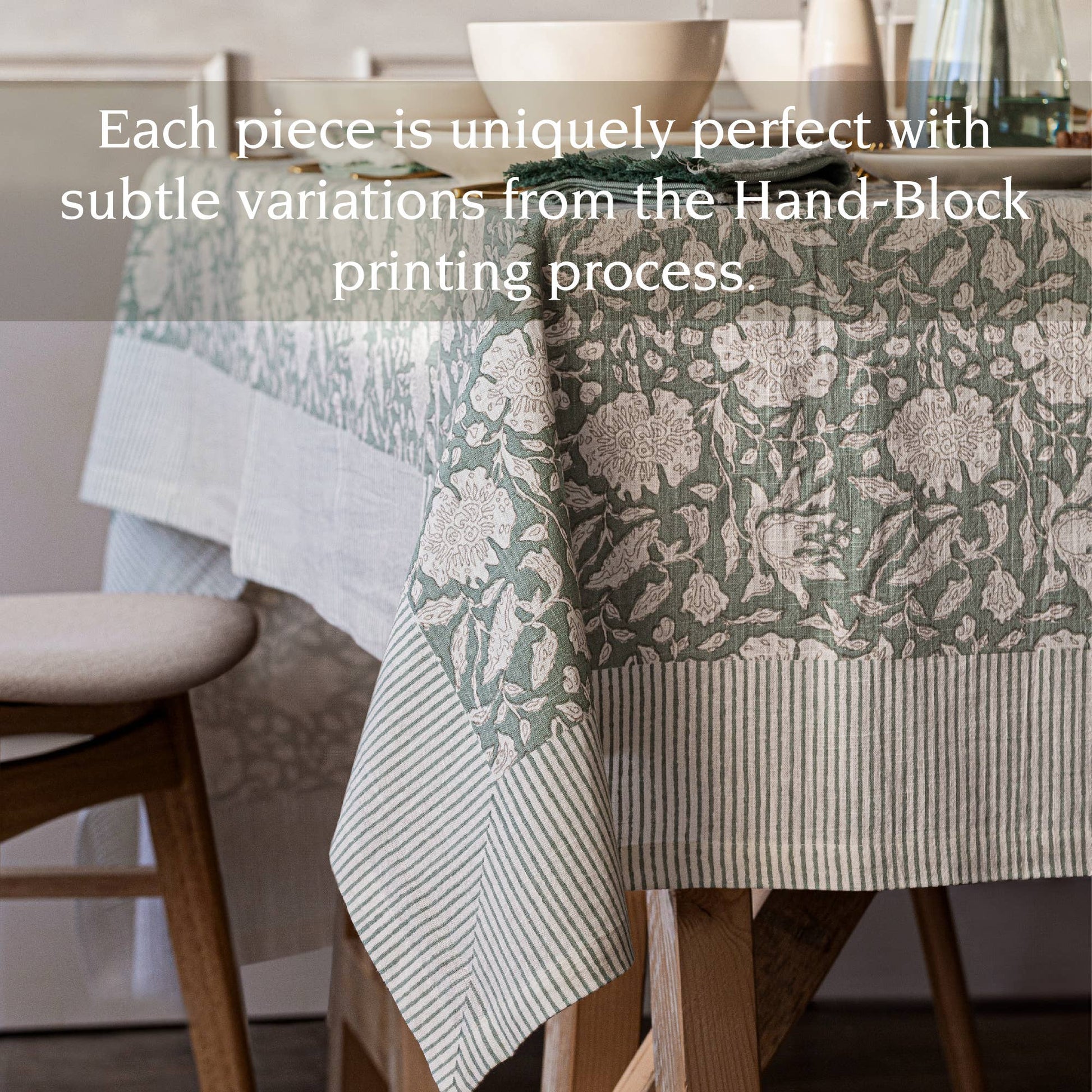 UNIQUE TABLECLOTH: Our artisans employ a centuries-old process that originated in India, using a different screen to apply each color by hand. Each piece may have subtle variations that make them perfectly unique, adding to their beauty and charm.