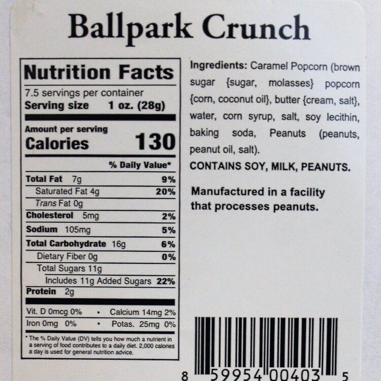 Ballpark Crunch | It's caramel coated popcorn with loads of caramelized Spanish Peanuts. One taste and you'll be singing "Take Me Out To The Ballgame!"