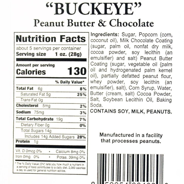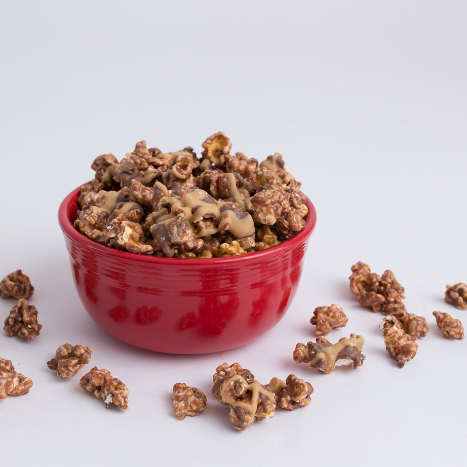 Buckeye | Delicious blend of chocolate popcorn drizzled with peanut butter, milk chocolate, and dark chocolate!