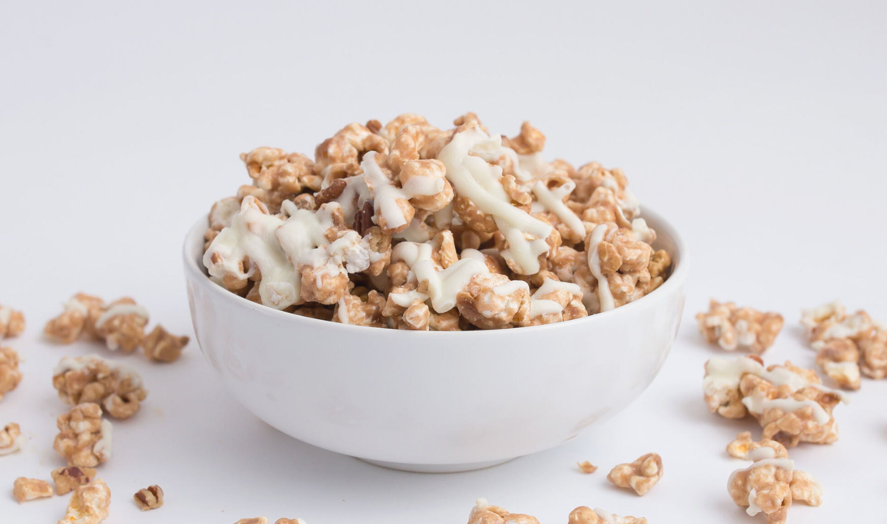 Cinnamon Pecan | Our Cinnamon Crunch popcorn topped with drizzles of white chocolate and nutty pecan bits.