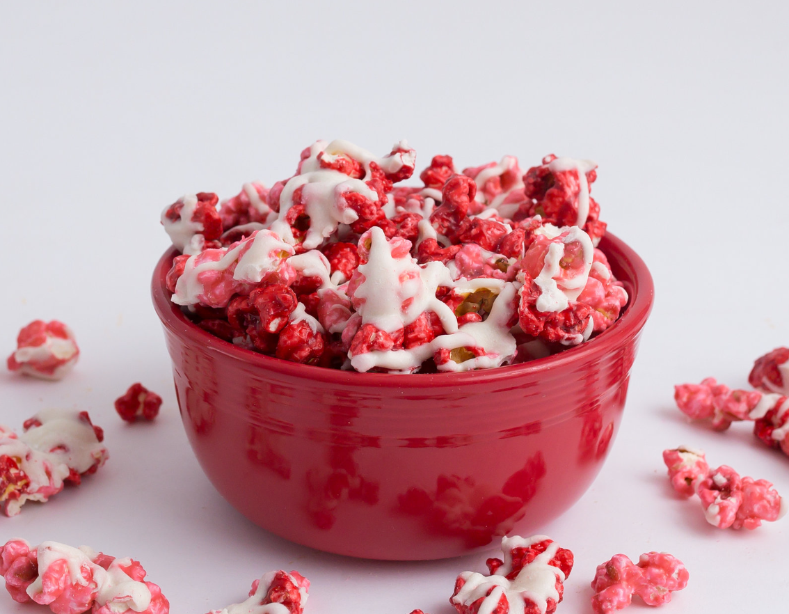 Sweet Heart Crunch | Refreshing blend of cherry and vanilla popcorn with a generous white chocolate drizzle.
