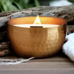 drummed for our collection, making them a beautiful piece of art to be displayed well after your candle has been enjoyed. With a crackling wooden wick that mimics a cozy fireplace, and fragrances that elevates any space, this candle is sure to be enjoyed by all. Each of our candles are hand-poured in small batches using only Phthlate free, Prop-65 free, and cruelty free ingredients. Our fragrances, waxes & wicks are all American made. Our wicks are made from various fruit trees using sustainable & restorative farming. Our fragrances are discerningly chosen, and made in America using premium ingredients collected from around the world. This candle was truly made to shine.