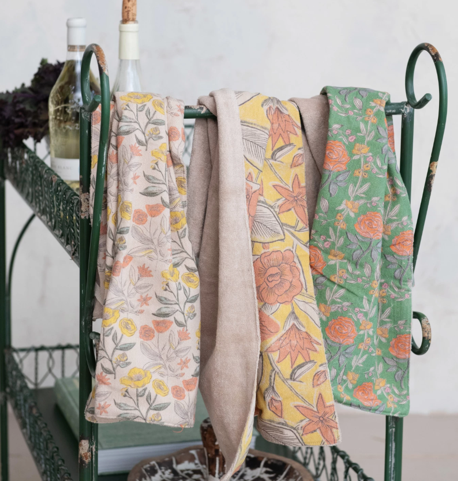 28"L x 18"W Cotton Printed Tea Towel w/ Floral Pattern & Terry Cloth Back, 3 Styles
